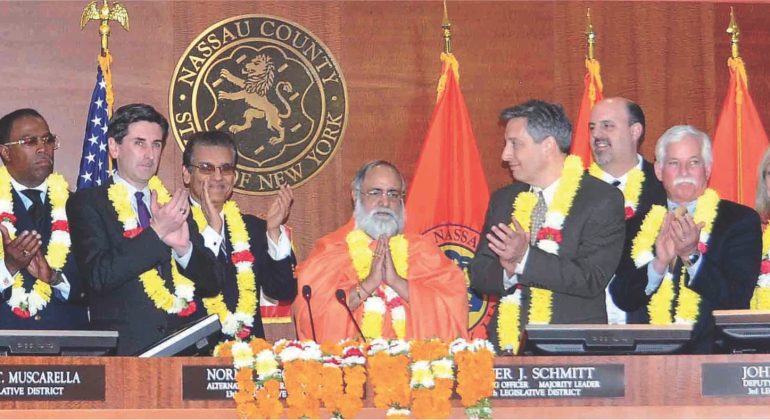 On April 29, His Holiness Mahabrahmrishi Shree Kumar Swamiji was felicitated with 9 citations in the assembly hall of Nassau County, New York. Many senators, senior judges of the Supreme Court of United States, the Mayor of the County, and state officials were present at the occasion.