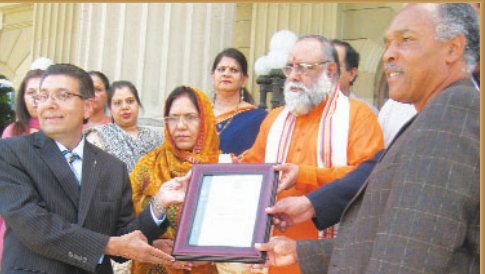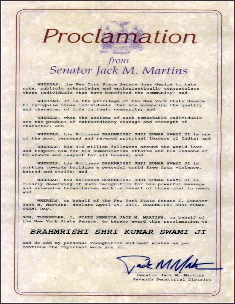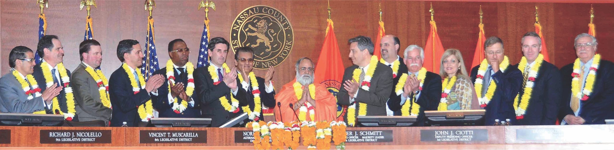 In America, Nassau County – Welcome Ceremony (L to R) TOH Honorable Mr. Mark Bonilla, TONH Honorable Receiver Mr. Charles Berman, NYS Assemblyman Honorable Mr. Tom McKevitt, Honorable Senator Mr. Jack M. Martins, NC Deputy County Executive Honorable Dr. Phillip Elliott, NC Legislator Honorable Mr. Wayne H. Wink, Jr., Honorable Mr. Varinder Bhalla, Former Commissioner, Nassau County, New York, Brahmrishi Shree Kumar Swamiji, TONH Mayor & Supervisor Honorable Mr. Jon Kalman, New York State Assistant Comptroller Honorable Mr. Joe Galante, New York State Assemblyman Honorable Mr. Charles D. Lavine, NY State Assemblywoman Honorable Mr. Michelle Schimell, Supreme Court Judge Honorable Mr. Thomas Adams, TOH Honorable Receiver Mr. Don Clavin, Supreme Court Judge Honorable Mr. Frank Gulotta, Mrs. R. Bhalla, Dy. Commissioner, Nassau County, NY.
