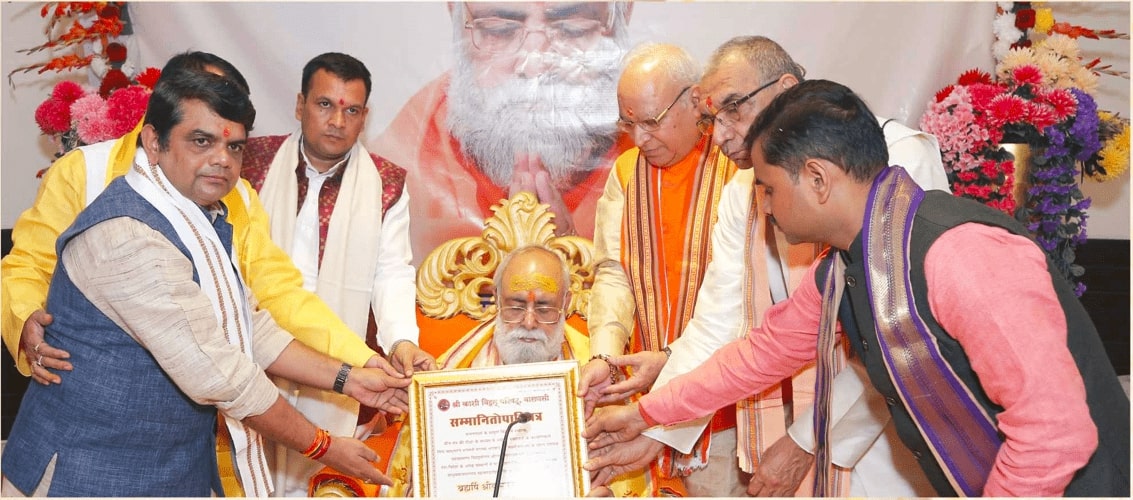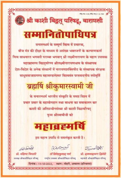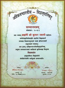 Kashi Vidvat Parishad, Varanasi has a significant role to play in the appointment of Jagatguru Shankracharya. Considering the contribution of Vishwa Sant Mahamandaleshwar Brahmrishi Shri Kumar Swamiji towards the Sanatan Dharma, Kashi Vidvat Parishad decided to honour Him with the title of “Mahabrahmrishi“.