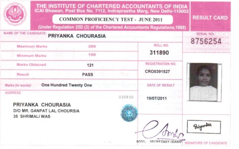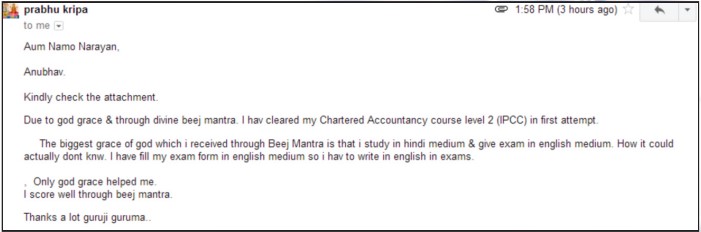 Miss Priyanka Chourasia, Ratlam, Madhya Pradesh shared her experience saying that ever since she received divine Beej Mantras, she is experiencing amazing changes in her life. By the grace of Beej Mantras, she has gained much confidence and she cleared her C.A. examination in first attempt. It was very surprising for her because she had completed her studies in Hindi, but had cleared her C.A. examination in English that too in first attempt. The divine Beej Mantras have truly amazing power. She further writes that she is grateful to Pujya Gurudev Ji for such grace in her life.