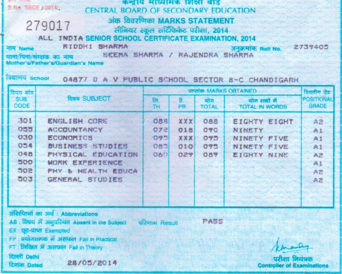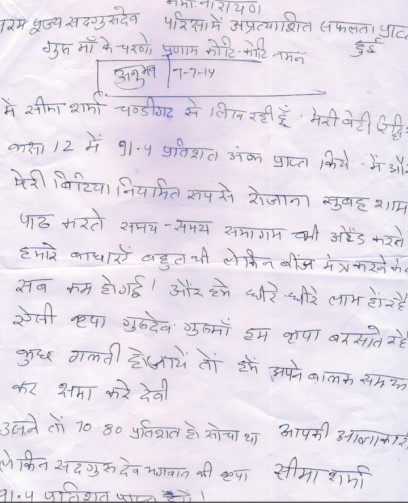 Smt. Seema Sharma, Chandigarh writes that her daughter Riddhi Sharma had received divine Beej Mantras from Pujya Guruddev Ji for receiving grace of goddess Saraswati. She and her daughter regularly recite divine Beej Mantras daily and attend Conventions too. Before divine path they were facing many problems but regular chanting of divine paath has solved many of their problems. She further writes that her daughter scored 91.4% marks in her 12th board examination, whereas she was expecting marks between 70-80%. She is grateful to Pujya Gurudev Ji, she writes.