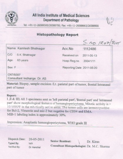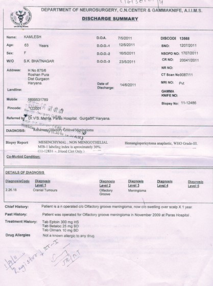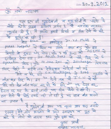 Smt. Kamlesh Bhatnagar, Gurgaon, Haryana told that I was suffering from a brain disease and the operation was done by Dr. V.S. Mehta at Paras Hospital. After a year, I again started suffering from the same disease and I had to be admitted in the AIIMS on 7th May 2011. I was operated for this disease six times by Dr. Ashish Suri. I was discharged from the hospital on 14th June, 2011. I was in the ICU for 40 days. During this period my husband Shri S.K. Bhatnagar continued practicing the divine paath of Beej Mantras. My ailment was so severe that nobody could believe that I would be healthy again. I and my husband had received the divine Beej Mantras at the Prabhu Kripa Dukh Niwaran samagam in 2006 at Gurgaon. The doctors at the hospital were surprised to observe how my disease got cured in such a short span of time. I am not taking any medicines now and am chanting the divine paath only. It all became possible by the grace of divine paath of beej Mantras. Pujya Gurudev, keep showering your grace always.