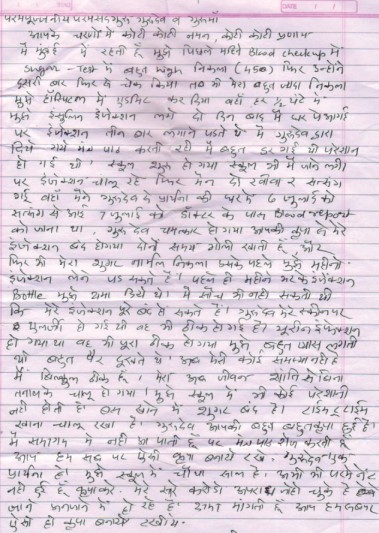 Smt. Jaya Barodkar, Mumbai writes that when she got herself tested for diabetes, the report showed 450 which is considered very high diabetes level. When the test was done for the second time, the diabetes level was again very high. She was admitted to the hospital and was given insulin injection in every half-an-hour. After two days she was discharged from the hospital. Doctor prescribed her to take two insulin injections everyday. Soon she developed other health issues of skin allergy, urine infection and ache in feet. She was worried and tensed. But she started attending her school and continued the divine Paath of Beej Mantras regularly. She started attending satsang at Dham centers on Sundays and made sure to do so twice a month. In satsang, she used to pray to Pujya Gurudev to heal her. Meanwhile another blood test was done and the report received on 7th July, the diabetes level was almost normal. Doctor stopped insulin injections and prescribed her to take two pills a day. She did not believe that she would get rid of insulin injections so soon. Now, she is completely healthy, her skin allergy and urine infection too got cured. She attends school regularly and does her daily chores at home. Life is peaceful. Pujya Guruji, thank you for your grace on us, she writes.