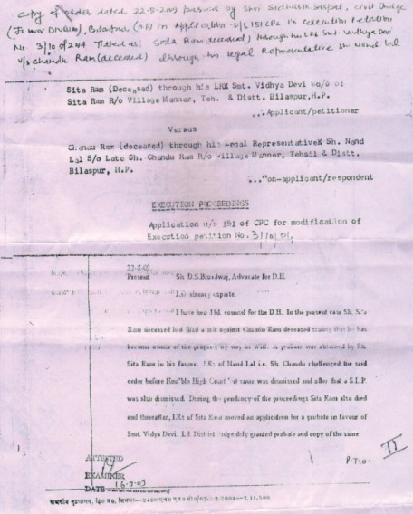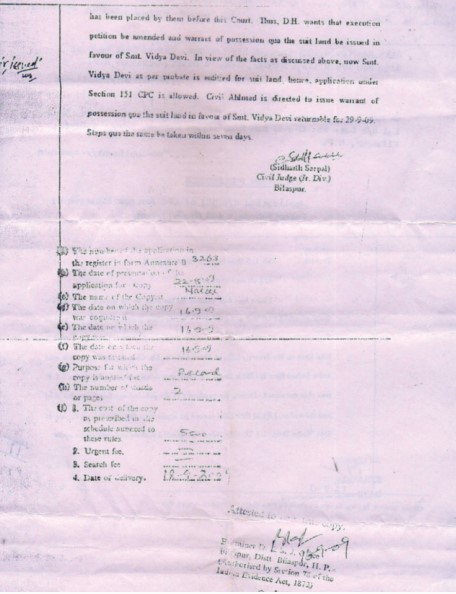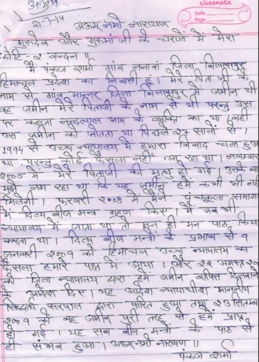 Shri Pankaj Sharma, Bilaspur, Himachal Pradesh writes that there was a land in his father’s name in Village Manner, Dist. Bilaspur. But, for the last 27 years, a person named Nand Lal had illegally occupied it. The case was in the High court since 1994, his father passed away in 2005. They had lost hope that they may not get this land back. He received Beej Mantras during the convention held at Panchkula in February 2008 and started doing the paath of Beej Mantras regularly. During the hearings in court, he used to recite Beej Mantras in his mind. By the grace of Beej Mantras, the High court, Himachal Pradesh decided the case in their favour on 9″ January 2009. On 22nd August 2009 the District Court issued order to give the land back to them. This order was passed by Hon’ble Judge Shri Siddharth Sarpal and on 23 September 2009, they got their land back. He is grateful to Pujya Gurudev Ji for showering His grace.