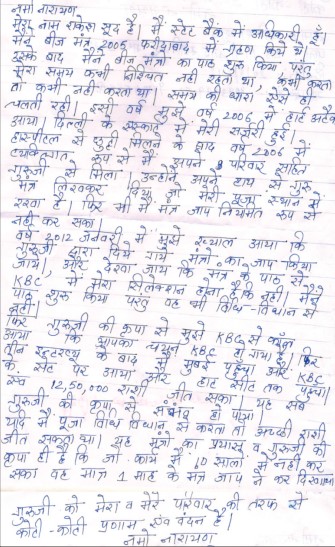 Shri Rakesh Sood, Gwalior, Madhya Pradesh told that I had received the divine beej mantras during the convention held at Faridabad in 2005. I was practicing the divine paath, but not regularly. I suffered a heart attack in 2006 and surgery was done at the Escorts Hospital, Delhi. Thereafter, I took vishesh kripa along with all the members of my family. Pujya Guruji gave me a mantra written by Him which is still lying at the place of worship at my home. I started doing the divine paath with an aim to get selected in the January 2012 Kaun Banega Crorepati programme. I was unable to do the divine Paath with proper procedure, yet I got selected in KBC. I was interviewed thrice and I went to Mumbai. I got opportunity to sit at the hot seat of KBC and won Rs. 12,50,000/-. It became possible only by the grace of divine paath and blessings ofpPujya Guruji. Which I could not accomplish during the last 10 years, that became possible by the effect of divine paath within just one month. Million times salutations to Pujya Guruji from me and my family members.